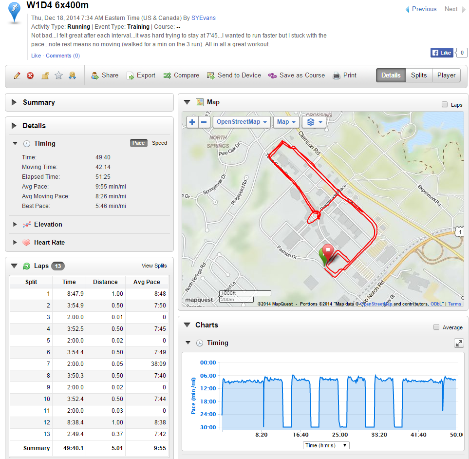 Well I made it back home safe and sound Wednesday evening. Which only meant that I was back to running by myself on Thursday morning. I decided to go into work late so I could get in a run during the daylight hours. I wasn’t really looking forward to running that morning because I was tired. But I did!!! Got up and headed to Sandhills and did a one mile warm-up and cool down with six 400 m runs at my 5k pace (7’45) thrown in between for a total of five miles. I did find it hard trying to stay at 7’45 during the sprints because I wanted to run faster (watch kept beeping) but overall I stuck with the pace for the most part. I do have to remember to come to a complete stop when I’m doing my two minute rest after each interval. I walked for a min on the 3rd one which increased my overall pace (and you know I’m all about that pace ’bout that pace). All in all a great workout looking forward to the next one.