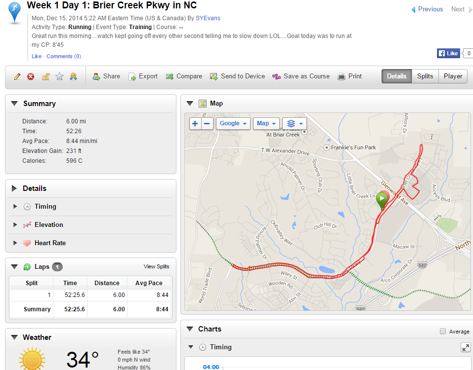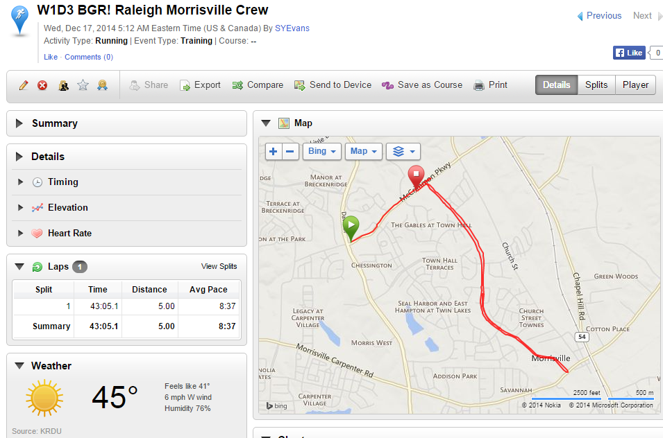 This run was an easy five miles at my CP (8’45). As you can see by my average pace this was somewhat difficult. I wasn’t quite sure where I was going so I had to run back towards the crew a few times. Got directions to run ahead but when I got to the end of the road I wasn’t sure if I was to turn right or left at the next turn, so I hightailed it back to the group. But they must had turned on another street because I didn’t see anyone. So I just headed back in the direction I started. May have increased my pace because I didn’t want the ladies waiting on me or to even be worried that I had gotten lost. Turns out that we all pretty much finished up around the same time. Another good meeting with my sole sistahs of BGR! Raleigh.
