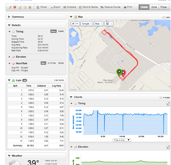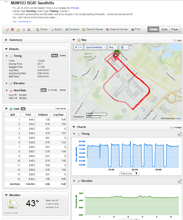 Went to Sandhills and did my repeats. My running coach switched it up on me this cycle. I started with a one mile warm-up at my CP followed by five repeats of the following: 3 mins at 8’15 and 1 min at 8’45. I started with my warm-up but half way through my satellite wasn’t picking up (so of course my pace was all jacked up) and somehow I messed around and hit lap (which ended that portion of my workout). But I did manage to get through my repeats without any issues and finished my run with a one mile cool down.