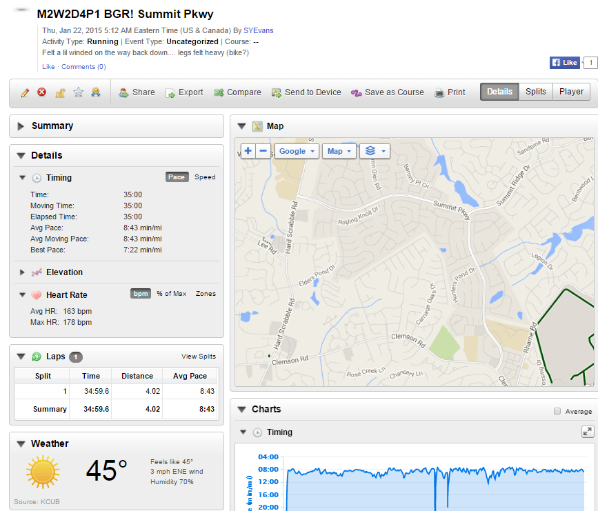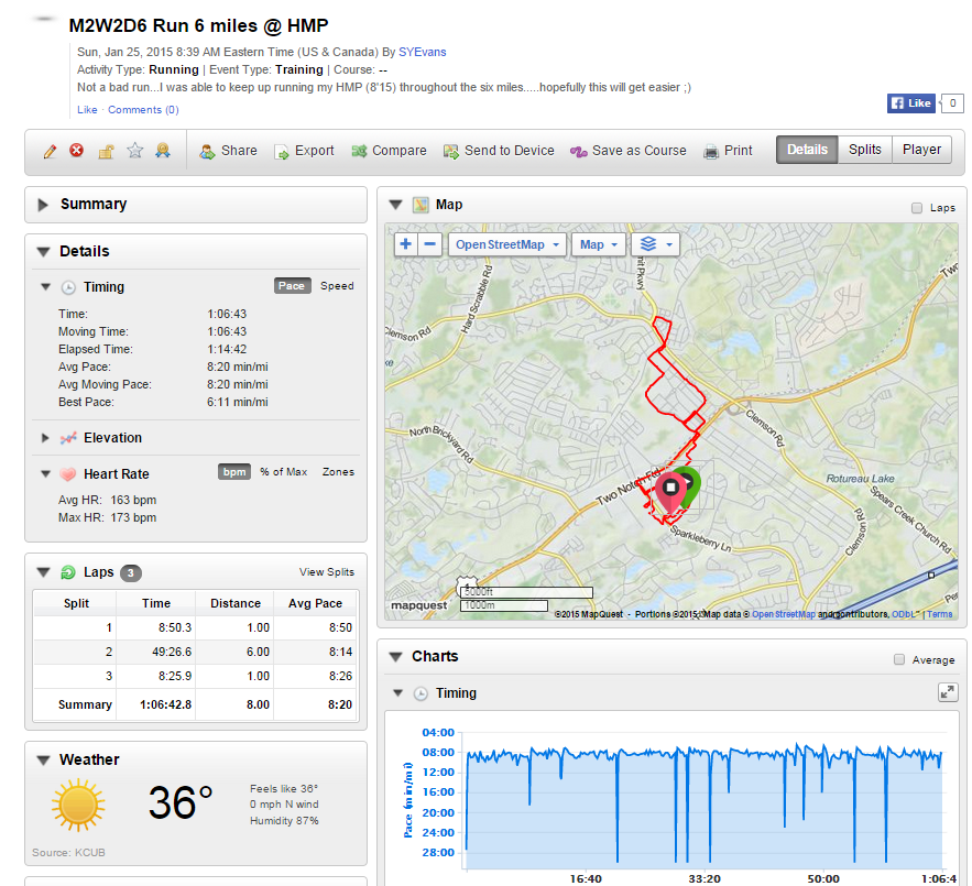 So after I made sure he was okay I hit the pavement for 8 miles. One mile warm-up, followed by 6 miles at my half marathon pace (HMP). I’m still not sure what that pace is but I was able to keep it at 8’15 today. You know I struggled with that about a few weeks ago and was only able to run them at 8’30. So, looks like I’m making some improvements in that area. I hope to be able to get to an 7’45-8’00 HMP (fingers crossed). I followed up those 6 miles with a one mile cool down at my CP but looking at the numbers below, I guess I was still pumped from running my 8’15 and finished my cool down at 8’20. Not bad still.