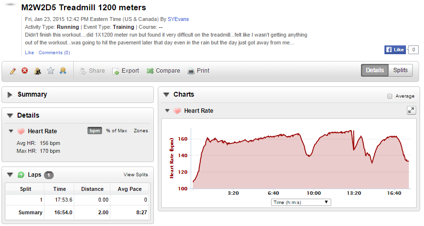 So running more than two miles at a faster pace on the treadmill that day, just wasn’t working for me. Sheat, I just couldn’t do it. I used the treadmill pace comparison and set the treadmill to 6.8 mph and a 1% incline to start out my warm-up. Ok, that wasn’t too bad (boring but not bad). Then I had to do my 1200 meters (3/4 mile) repeats at my 5K pace (7’45) so that means I’m trying to run on this treadmill at 7.7 mph. WHOA…now that was work!!! I couldn’t do it…so I stopped after the first 1200 meters and figured (yeah I know) I would just run later in the day…rain or shine (well I didn’t). My life sometimes really just gets in the way. Oh well…I will get it done on the pavement next week.