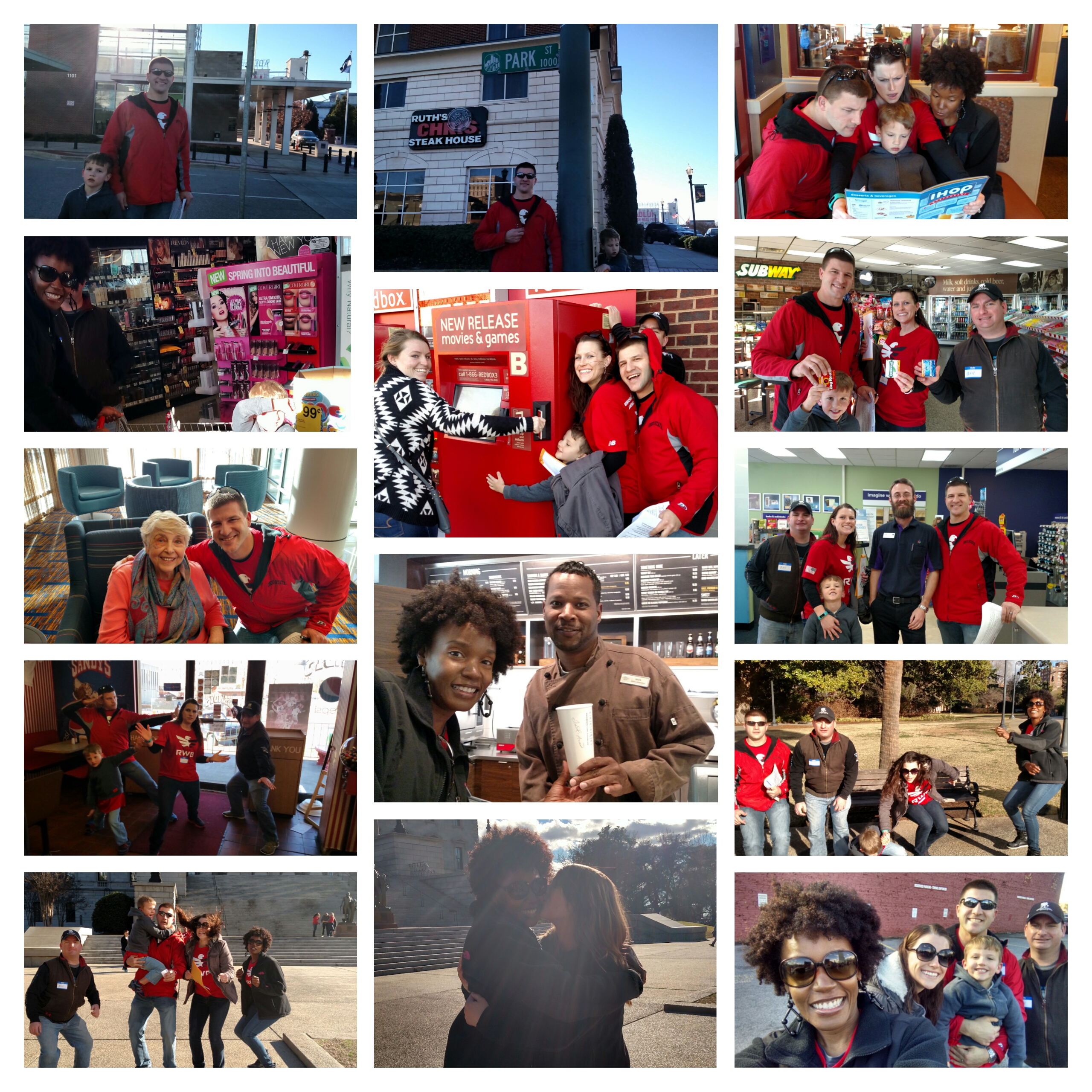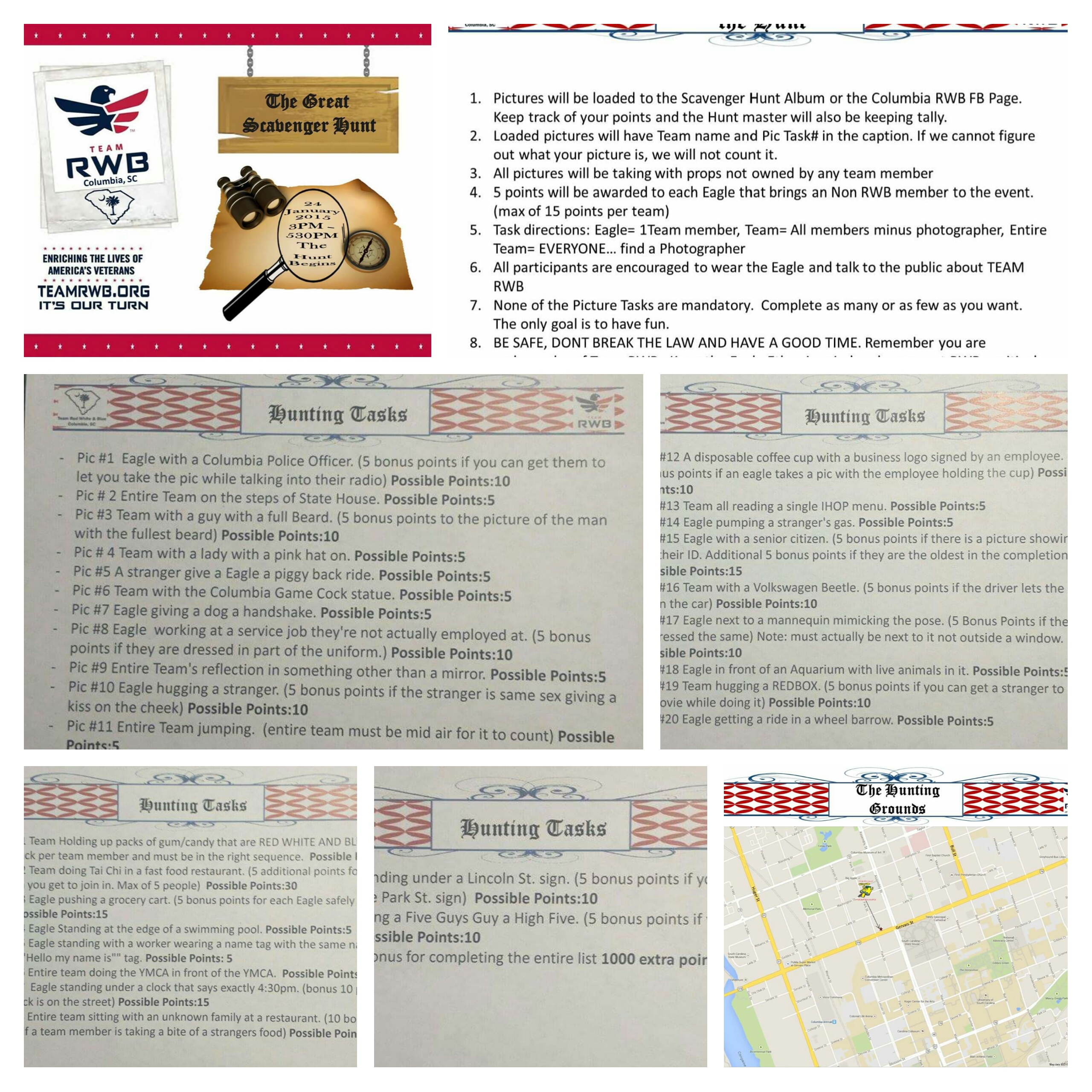 On Saturday, we had our very first Columbia RWB Photo Scavenger hunt. About 35-40 members met at Mellow Mushroom and were divided up into teams of four. We were then given a list of 30 photo task and a map of downtown Columbia. We had two and a half hours to complete as many task that we could before meeting back at Mellow Mushroom for fellowship and drinks. OMG this was so much fun. Remember above when I told you my goal for the next RWB meetup was to meet at least two new members and learn something about them. Well I met four and a half new members. I was teamed up with three and a half of them; Dan, Jamie, Ryan and their son Everette.