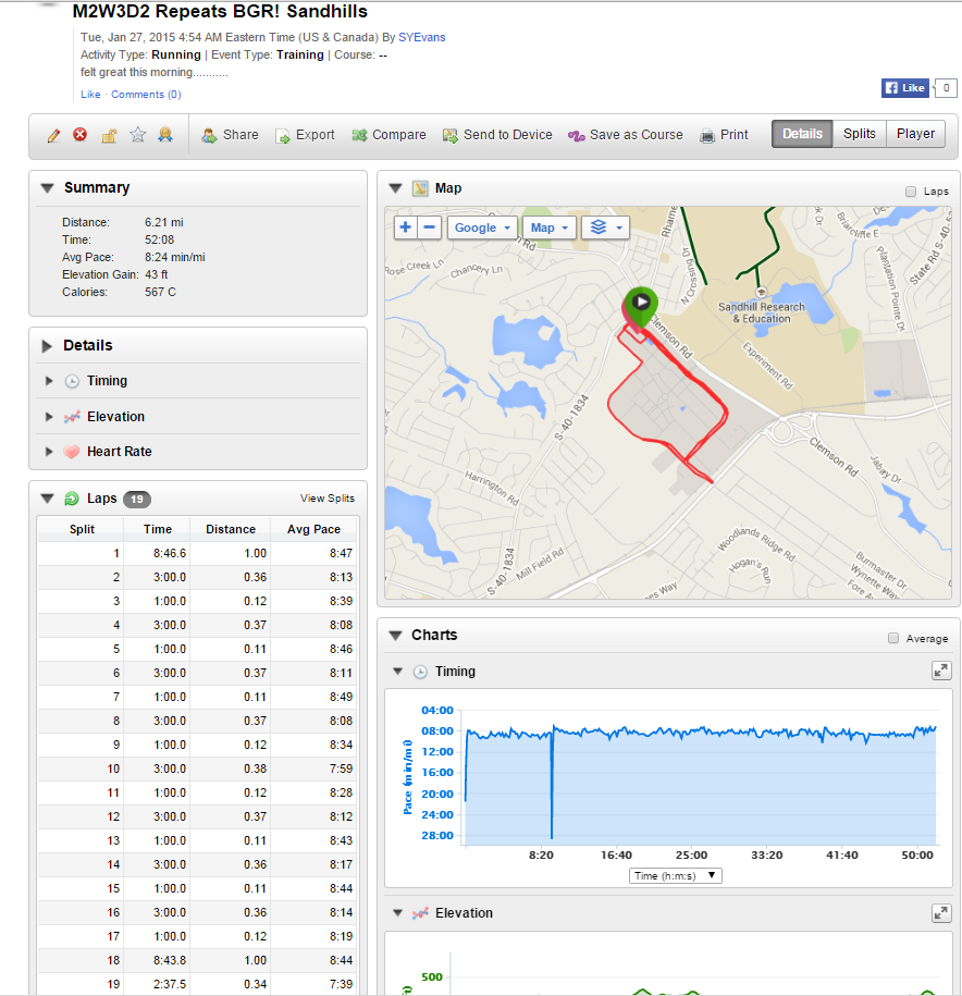 We got in 3-6.5 miles. This training run consisted of me doing a one mile warm up at my CP followed by eight repeats of three minutes at an 8’15 pace and one minute at 8’45. I finished this run up with a one mile cool down for a total of 6.21 miles. Now this run was great and I felt awesome. FANTASTIC!!!