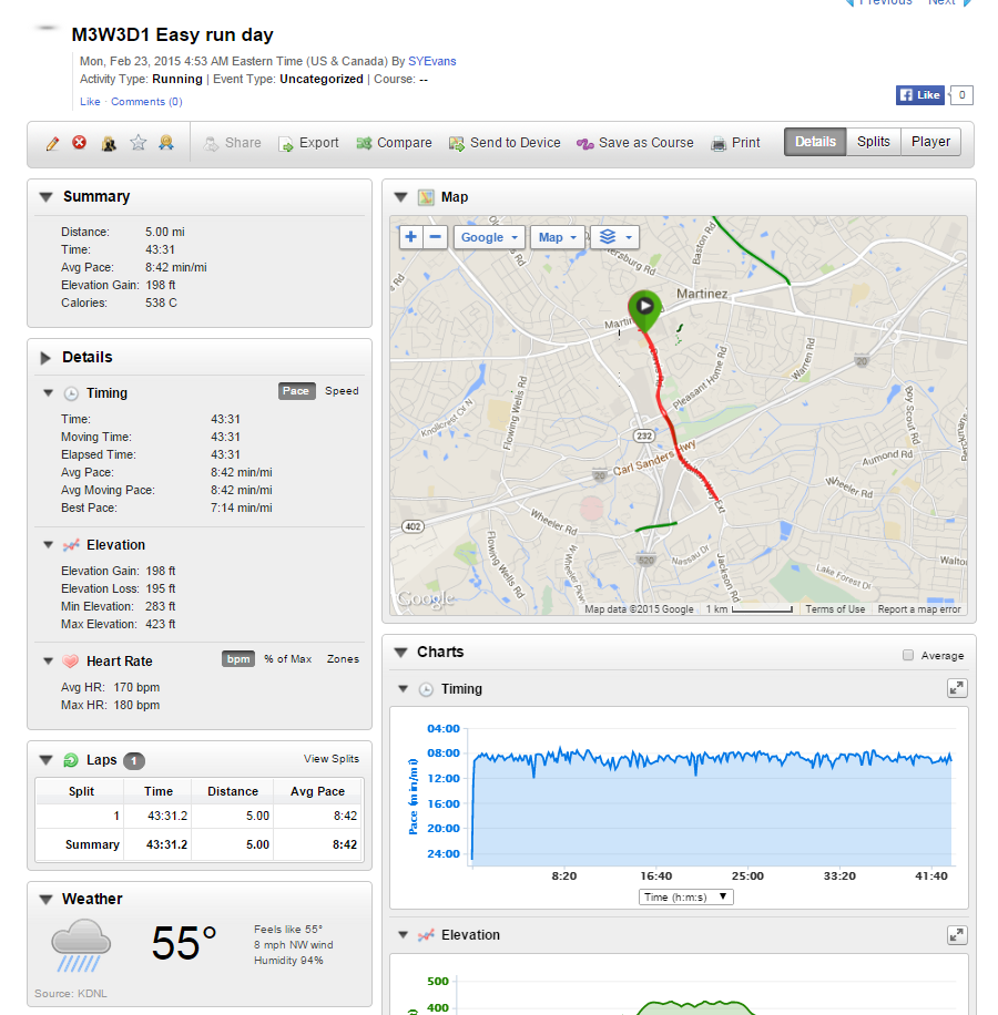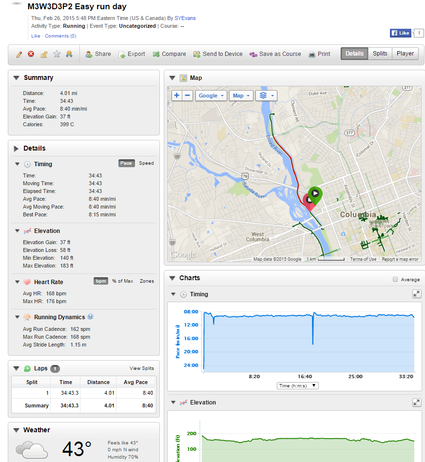 On Tuesday we were expecting some pretty bad weather so there was no group run posted in the group. I woke up at my regular time (no bad weather) and decided I would just run later after work when it’s a little warmer (yeah right). Wednesday pretty much played out the same way Tuesday did except I did get in a mini workout at home (weights on deck). My plan moving forward was to double up on my runs the next couple of days in preparation for the Palmetto 200 mile relay.