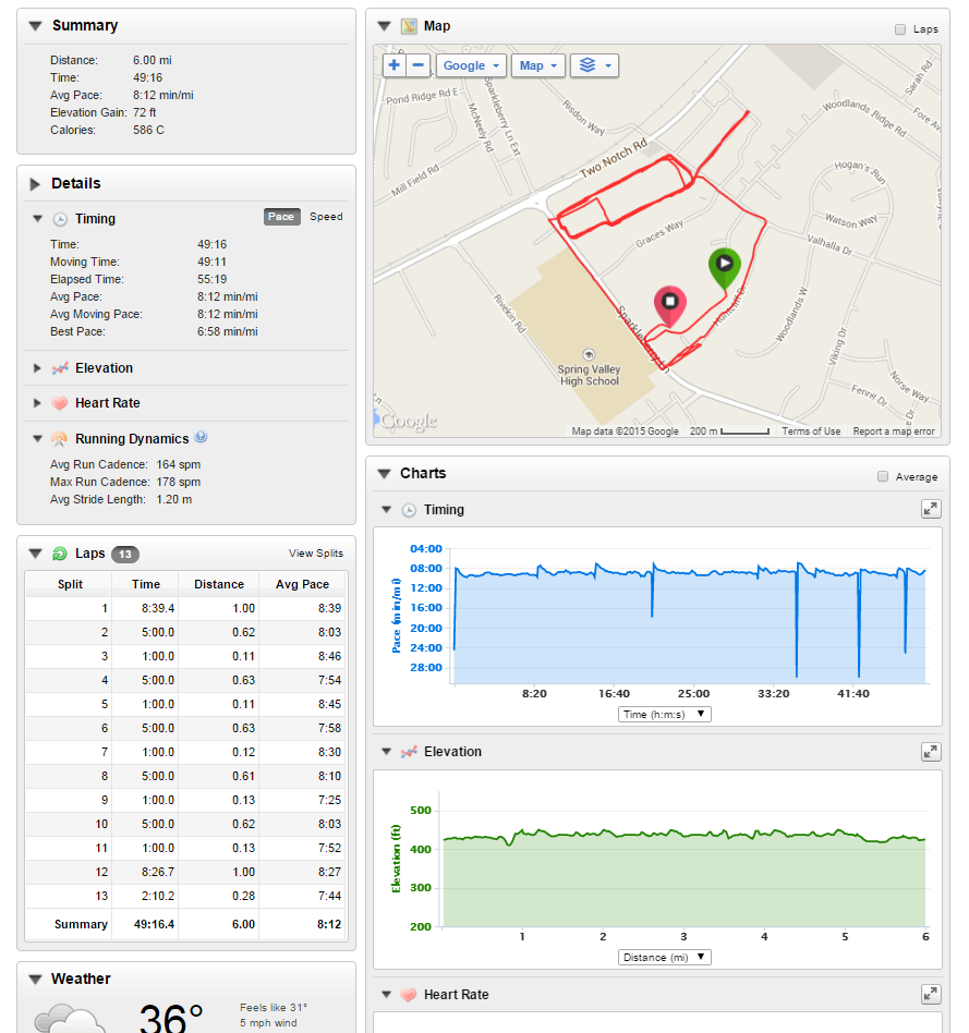 Thursday, woke up and hit the pavement around seven. Once again, I felt great. This training run consisted of me doing a one mile warm-up at my CP (8’45), five repeats of a five minute run at an 8’15 pace with one minute at my CP, followed by a one mile cool down at my CP. Looking at my splits, I think I did pretty good (even if I was faster than 8’15 but I really tried).