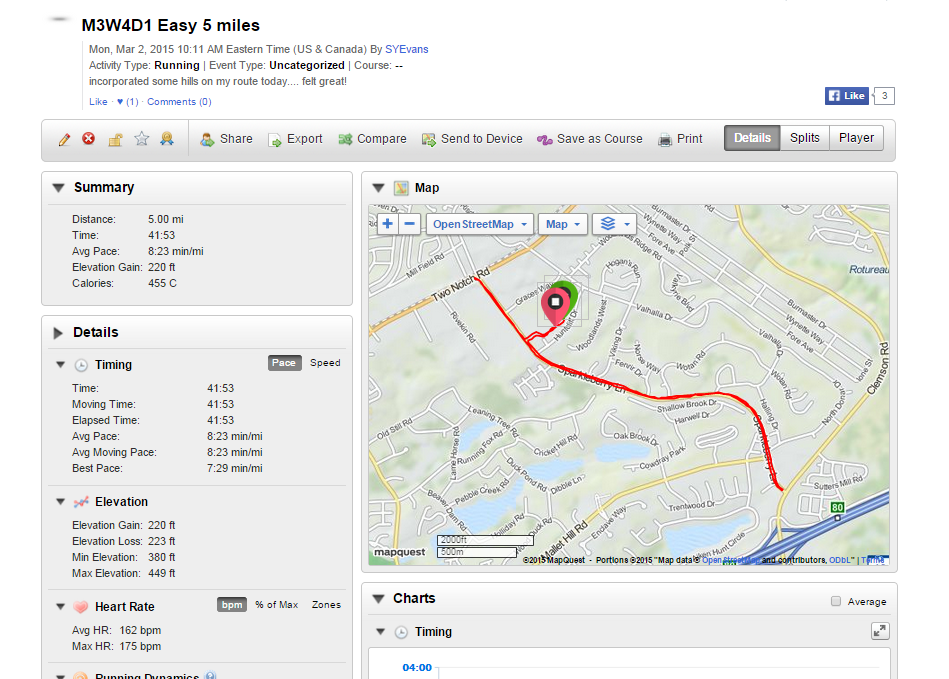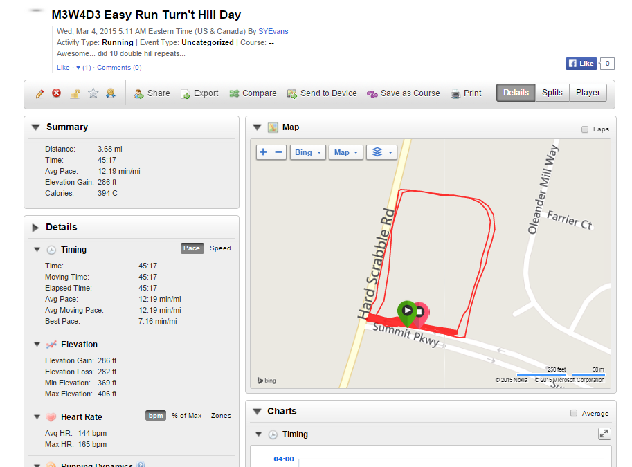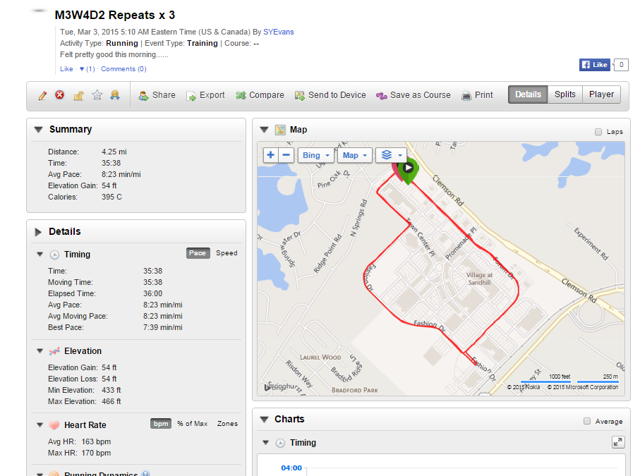 As I stated above, the first few days of my week were AWESOME!!! Monday was an easy run day, consisting of five miles at my conversation pace. I decided to run up and down Sparkleberry since it was an easy run and I knew there would be plenty of hills. My goal from here on out is to focus on hills at least twice a week if not more. This should prepare me for the hills in Raleigh, NC (fingers crossed). Even with the hills sprinkled in, I was able to maintain an average pace of 8’23 (not bad).