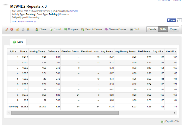 My plan for this run was simple since this was the last week of my mesocyle. I warmed-up with a one mile run at my CP, then 3 repeats of 5 mins at 8’15 pace and 1 min at 8’45, followed by a one mile cool down at my CP. That was a pretty easy run and I felt great.
